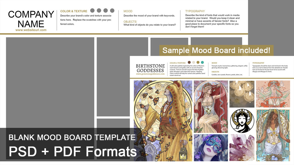 PDF, PSD, and a sample mood board.